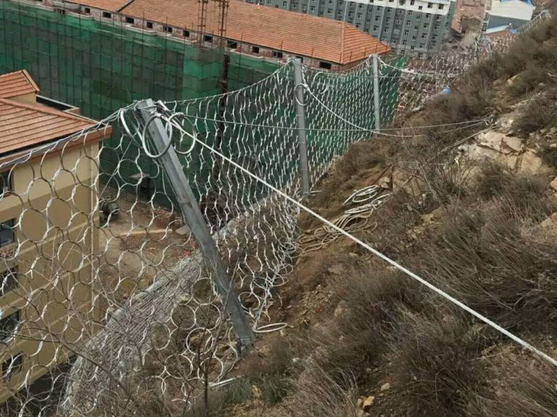 RXI-100被動的規格:R9/3/300網型,9圈環形網、金屬絲直徑為3毫米、網孔為300毫米。每根立柱配備一個消能減壓環,采用上下Φ18雙支撐繩。上拉與側拉錨繩均采用Φ16鋼絲繩。